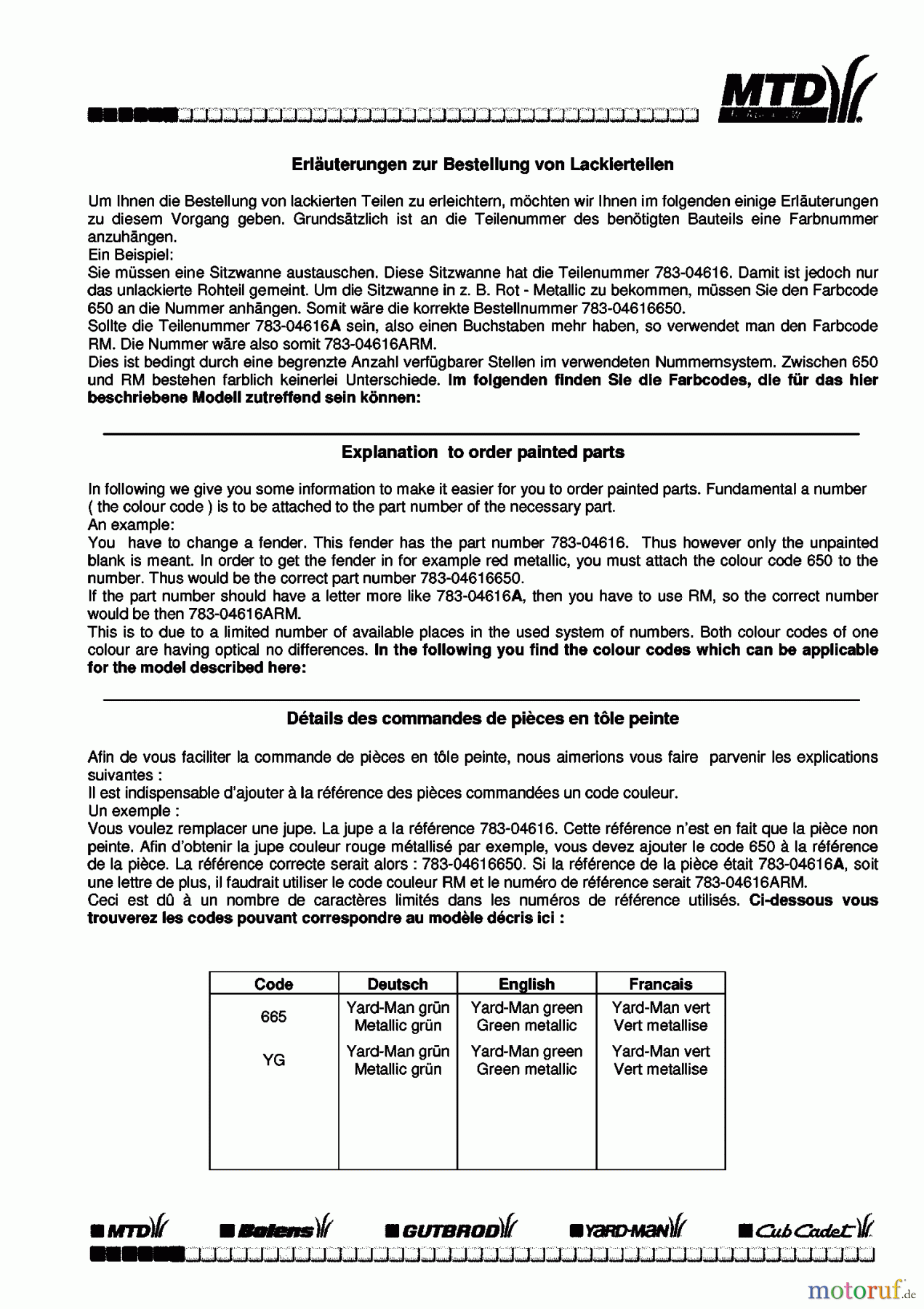 Yard-Man TE 7135 13AH77YE643 (2009) Farbcode Information Ersatzteile