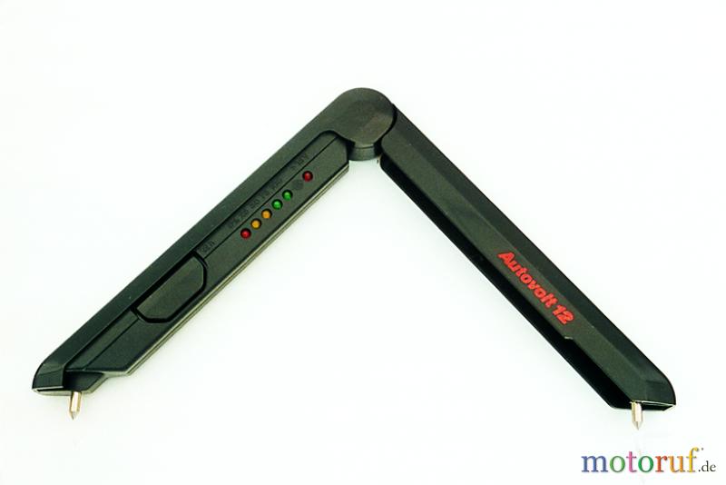 TESTGERÄT AUTOVOLT 12. Prüft 12-Volt-Batterien ohne Beachtung der Batteriepolung. Kein Abwarten der Ruhespannung notwendig. Meßspitzenabstand von 0 - 340 mm stufenlos einstellbar. Anzeige des Ladezustandes von 0, - 25, - 50, - 75, - 100%.